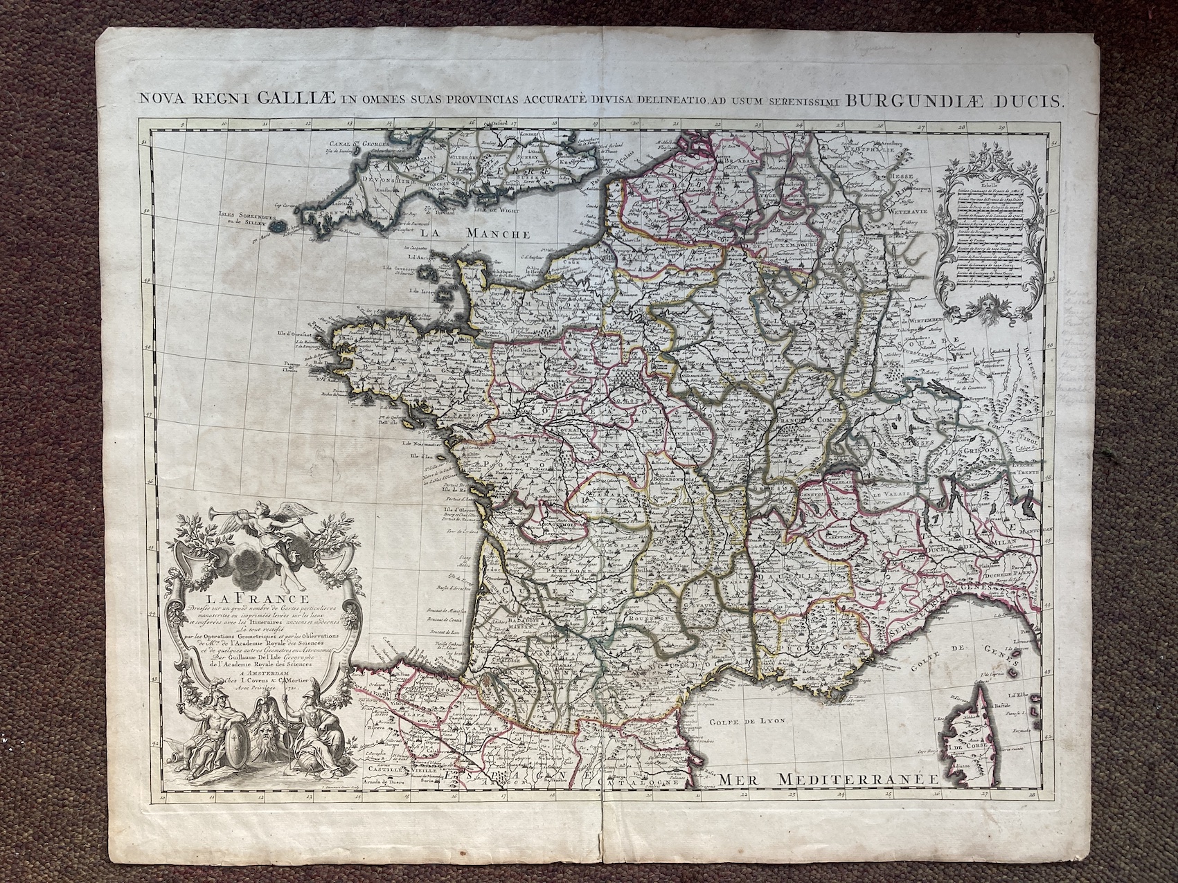 13280. Guillaume De L'Isle. LA FRANCE..1721, Amsterdam, I. Covens & C. Mortier, 64cm x 54cm, hand coloured outline, ornamental cartouche. Reinforced on centre fold, otherwise good. 150.00 pounds.